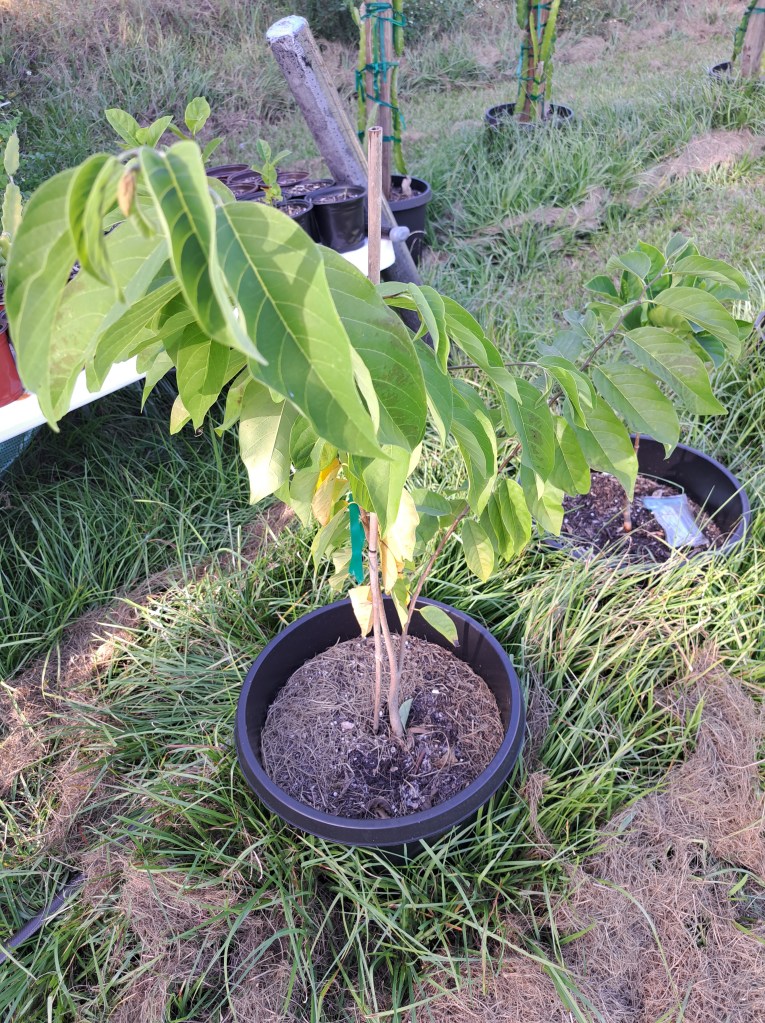This sugar apple tree is growing fabulously! It seems to really like the pot. The one grown in the ground, not so good. It’s dark green and healthy, but much smaller than this one. This one is over 2 feet tall. This is the green variety. The fruits that these trees produce are very expensive, if you can find it.