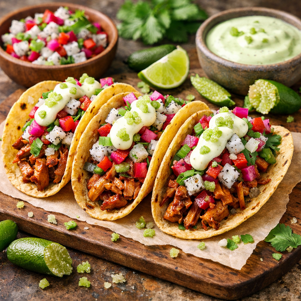 Assemble: jackfruit → salsa → crema.